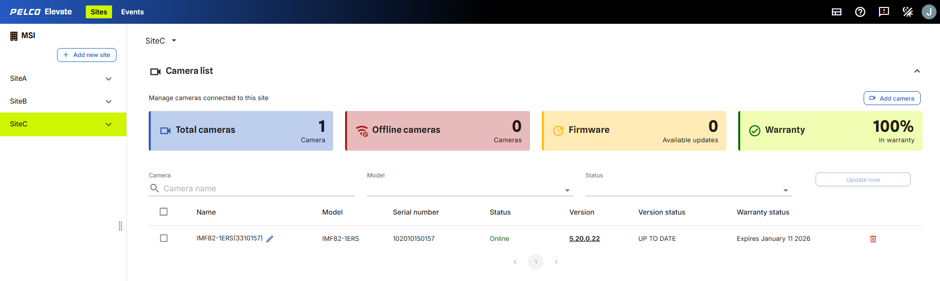 At the top of the Camera List, you can find the number of cameras, the number of offline cameras, the number of cameras that can upgrade firmware and the percentage of cameras within warranty.